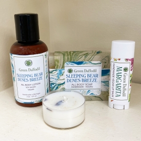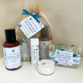 A regional scent to celebrate Michigan. Close your eyes and breath in to transport you to Summers Up North at the dunes. Clean, fresh, and green scents bring this combination together. Each gift set contains a Sleeping Bear Dunes Breeze individual soy candle tea light, a bar of soap, a mini soy lotion bottle, and a tube of Margarita flavored lip balm. All these goodies are beautifully packaged in a silk organdy bag and finished with ribbon and hang tag!