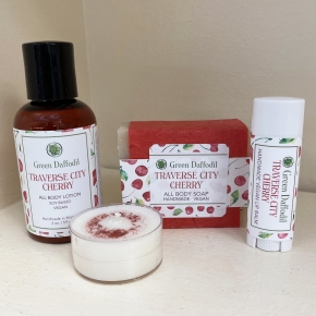 One of our regional scents to celebrate Michigan. This fragrance will transport you to the cherry festival Up North in Traverse City, all the cherry orchards and farm stands! It is sweet, tart and just fruity fun! Each gift set contains a Traverse City Cherry individual soy candle tea light, a bar of soap, a mini soy lotion bottle, and a tube of flavored lip balm. All these goodies are beautifully packaged in a silk organdy bag and finished with ribbon and hang tag!